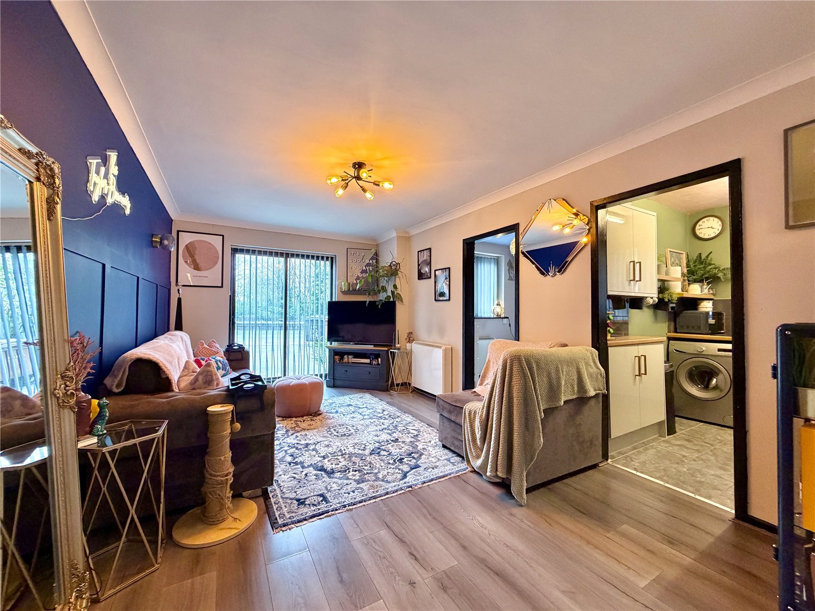 Upon entering the property, you are welcomed by a bright and inviting entrance hall leading through to a spacious living area. This impressive room benefits from large sliding doors, allowing an abundance of natural light and providing access to a charming Juliet balcony.