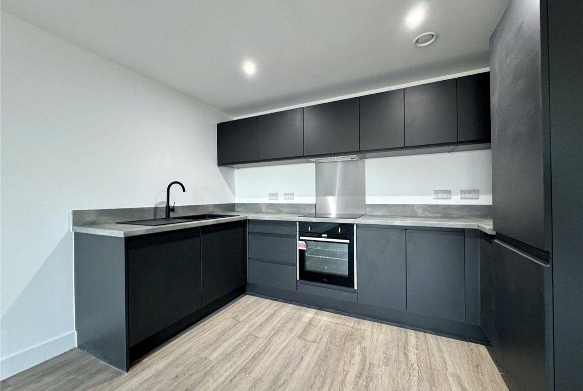 The contemporary kitchen is fitted with integrated appliances and complemented by large windows that allow plenty of natural light to fill the space, creating an ideal environment for both relaxing and entertaining. The living area also benefits from access to a Juliet balcony.