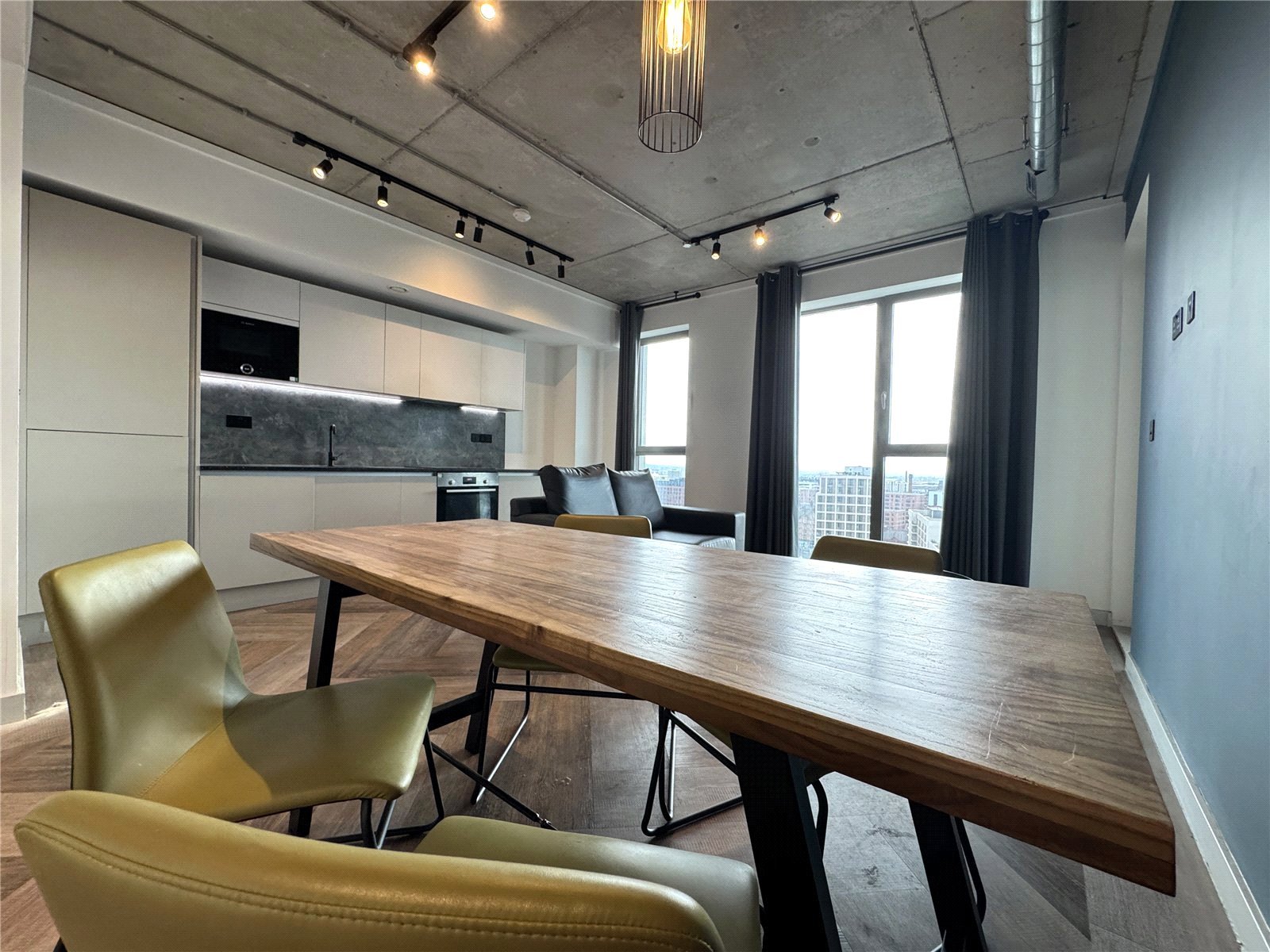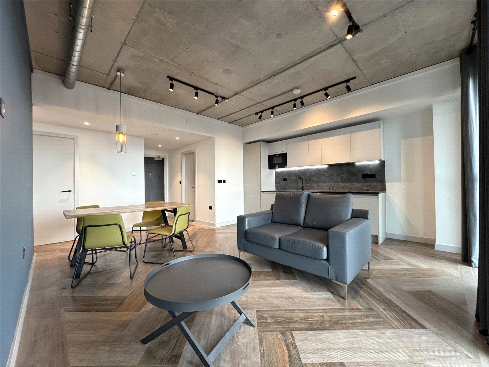 The apartment features a modern open-plan living space, combining lounge, dining, and kitchen areas — perfect for tenants seeking stylish, city-centre living. The kitchen is fitted with grainte worktops and wood grain antique maple floors for a touch of luxury.