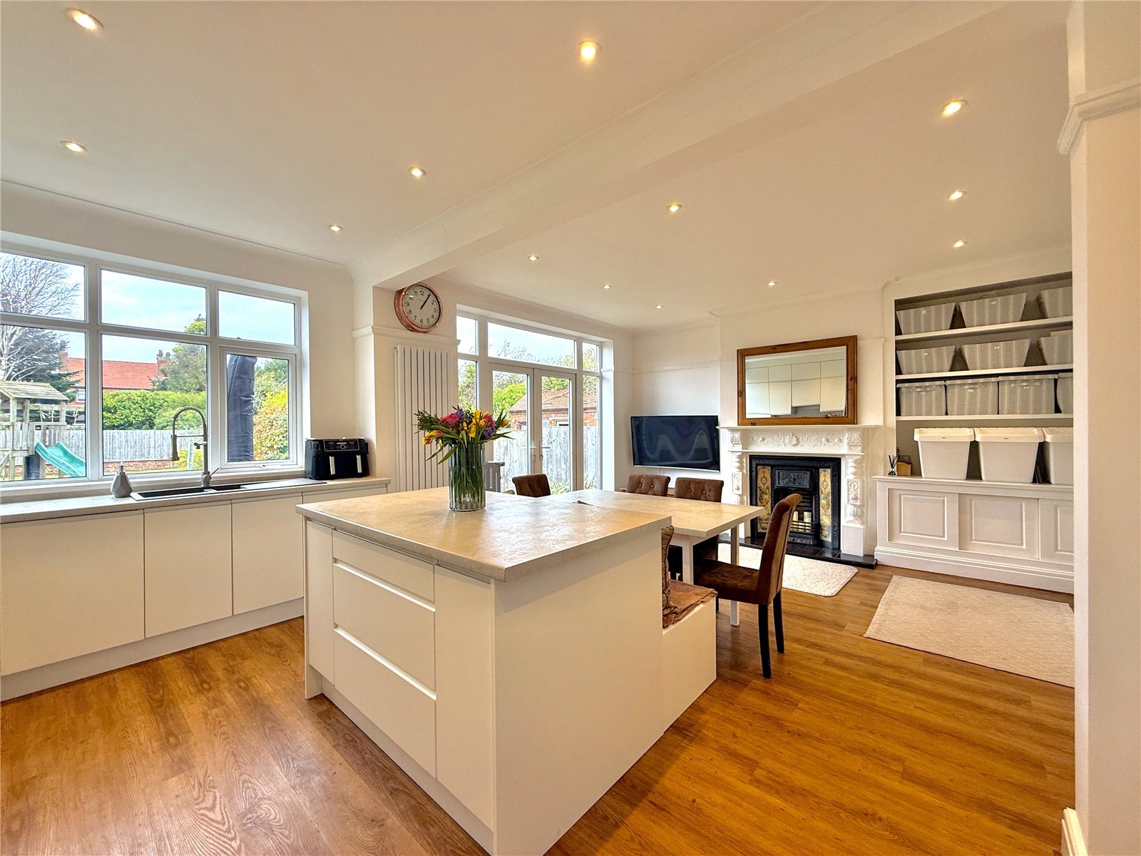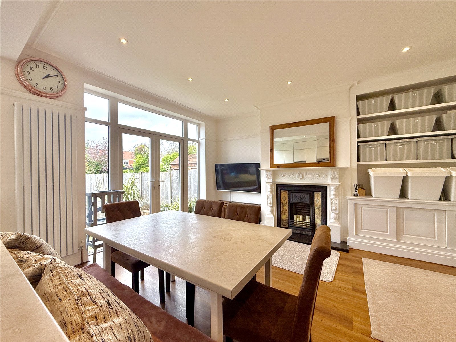 To the rear of the ground floor lies the true centrepiece of the home – a breathtaking open-plan kitchen and dining space. This beautifully designed room features high-quality contemporary kitchen units, a central island, and a bespoke built-in seating area integrated into the dining space. Large windows flood the room with natural light while offering stunning views across the rear garden. The space also benefits from side access, French doors opening onto the patio, and even retains an additional original fireplace, perfectly blending character with modern design. A convenient downstairs W/C completes the ground floor accommodation.