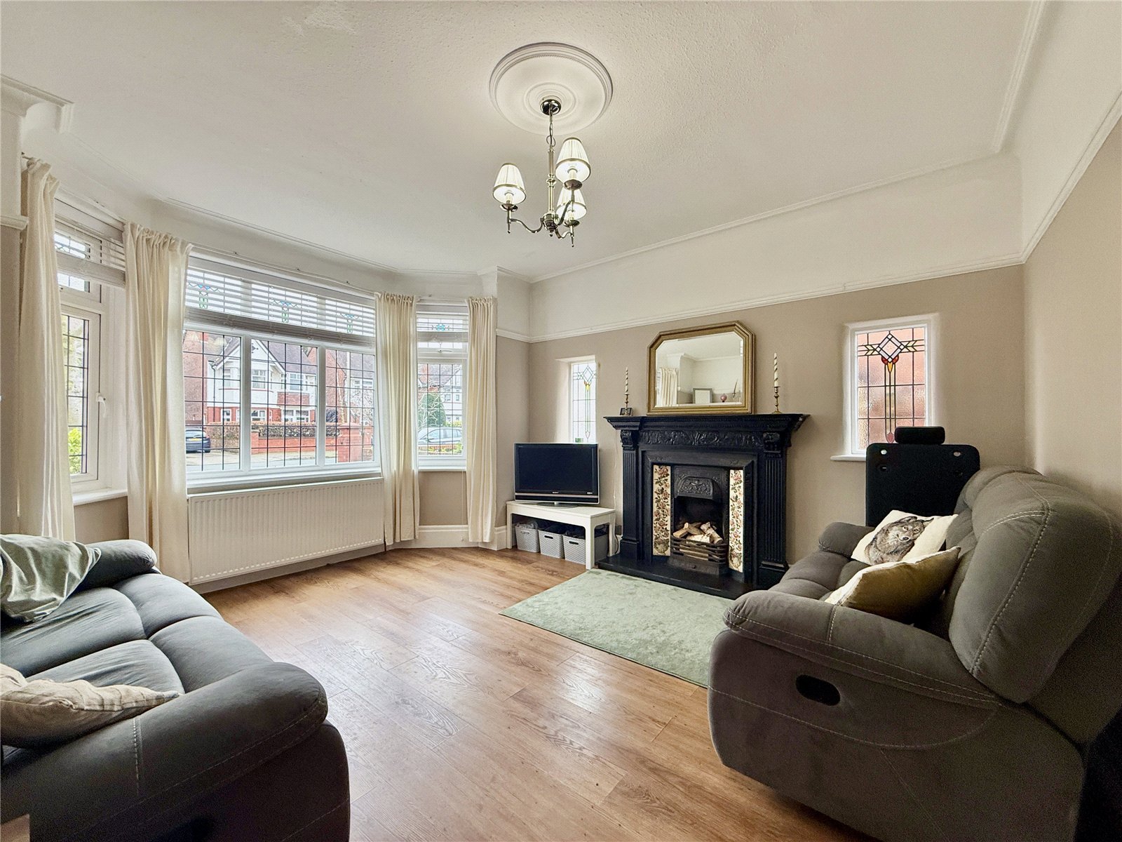 To the front of the property is a spacious and elegant living room, complete with a striking original fireplace, creating a warm and inviting space perfect for relaxing or entertaining.