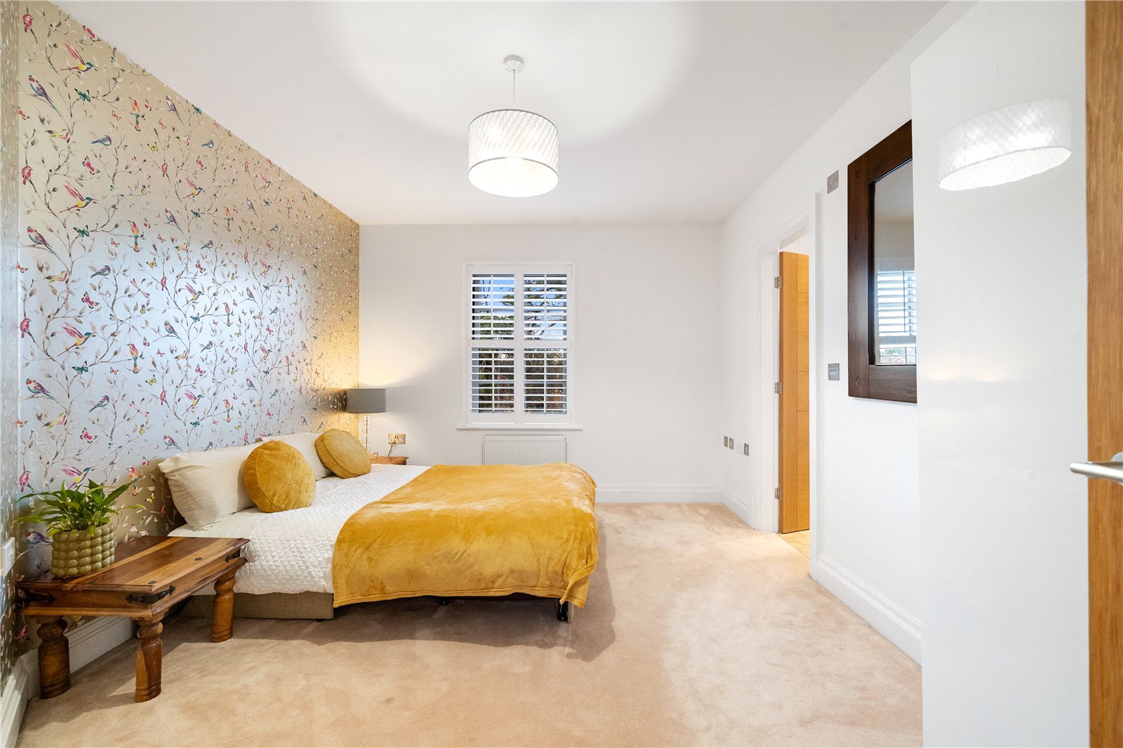 Ascending to the first floor, the generous landing leads to a stunning west-facing balcony that overlooks the front garden and the beautiful surrounding area. Bathed in natural light, this peaceful spot is the perfect place to enjoy breathtaking sunsets and take in the leafy surroundings.