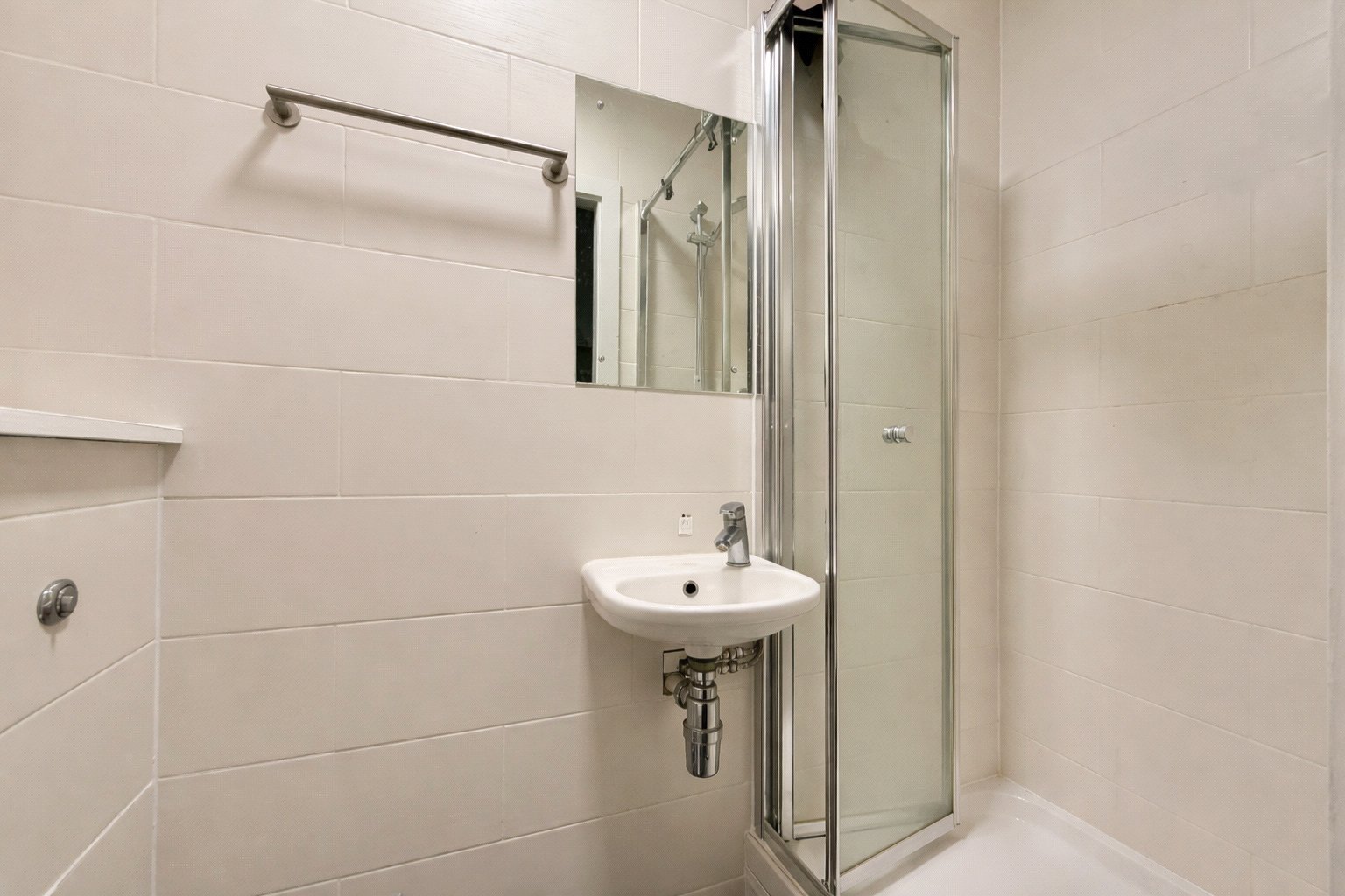 This room offers a comfortable living space with a double bed, generous built-in storage, and a practical desk area, perfect for student life. The modern en suite shower room adds convenience and privacy.