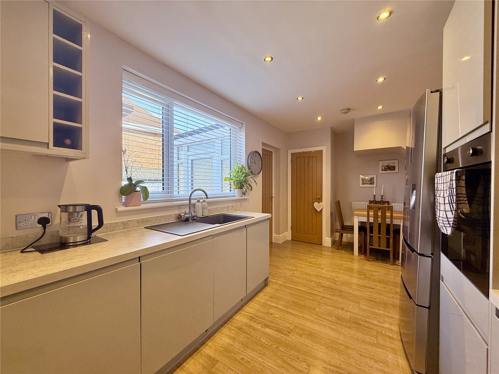 Upon entering, you are welcomed by a porch and entrance hall leading through to a bright and spacious living room. Adjacent is a modern kitchen/diner, fitted with sleek cabinetry, ample worktop space, and integrated appliances, creating a perfect space for both everyday living and entertaining.