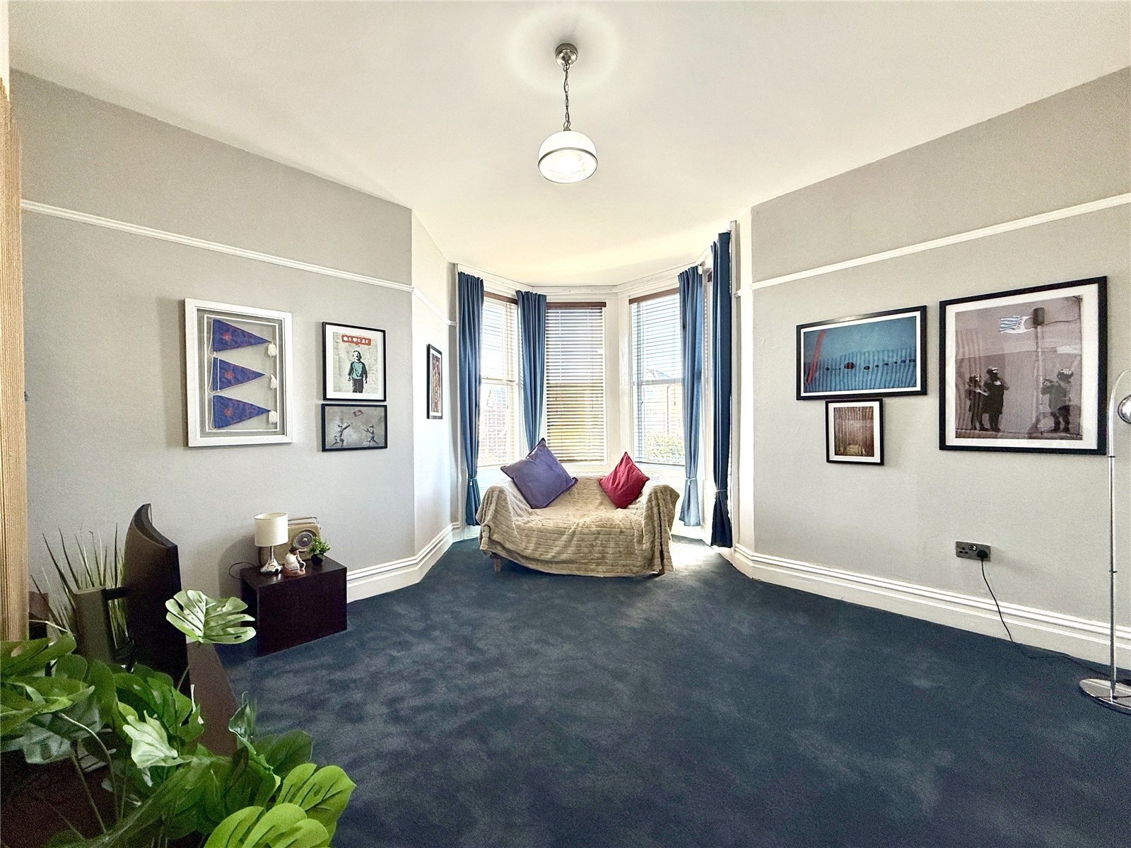 The impressive living room is a standout feature, boasting a striking corner bay window that frames stunning views across the Marine Lake, creating a light-filled and inviting space.