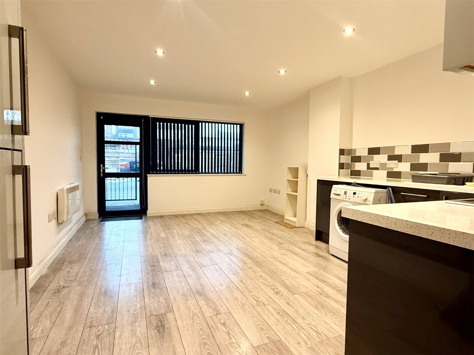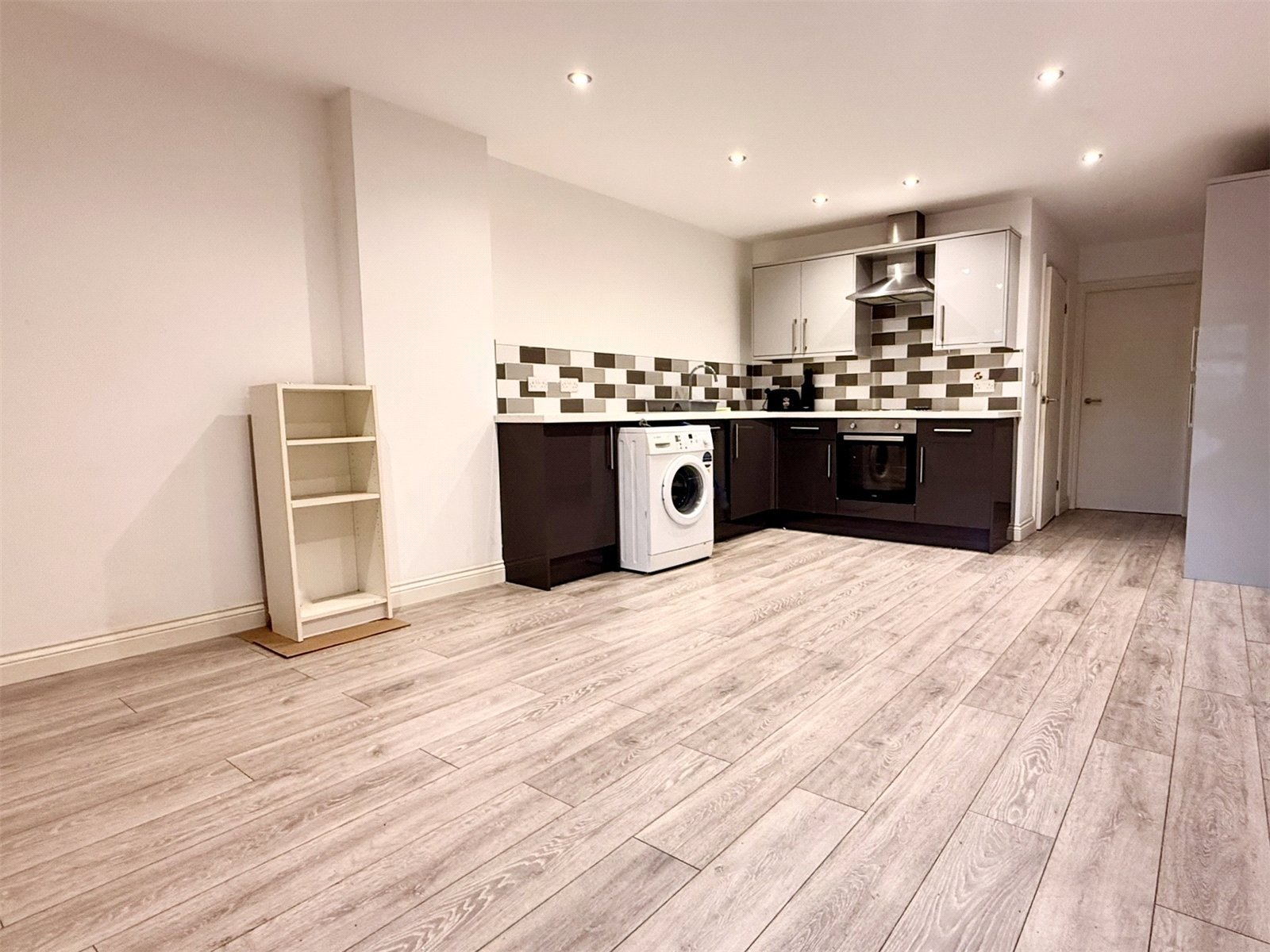 The kitchen is fitted with essential appliances including a washing machine, hob and oven.
