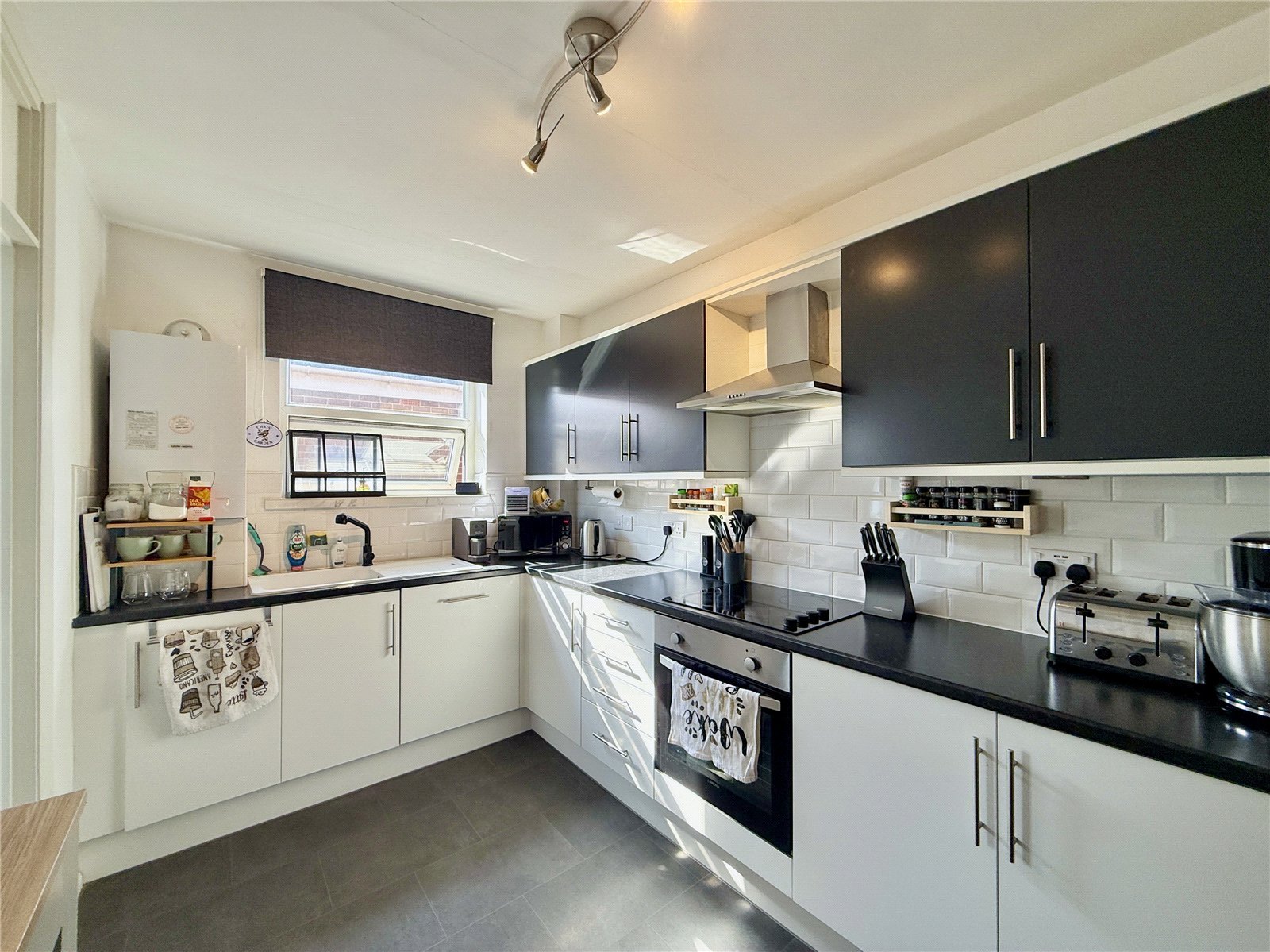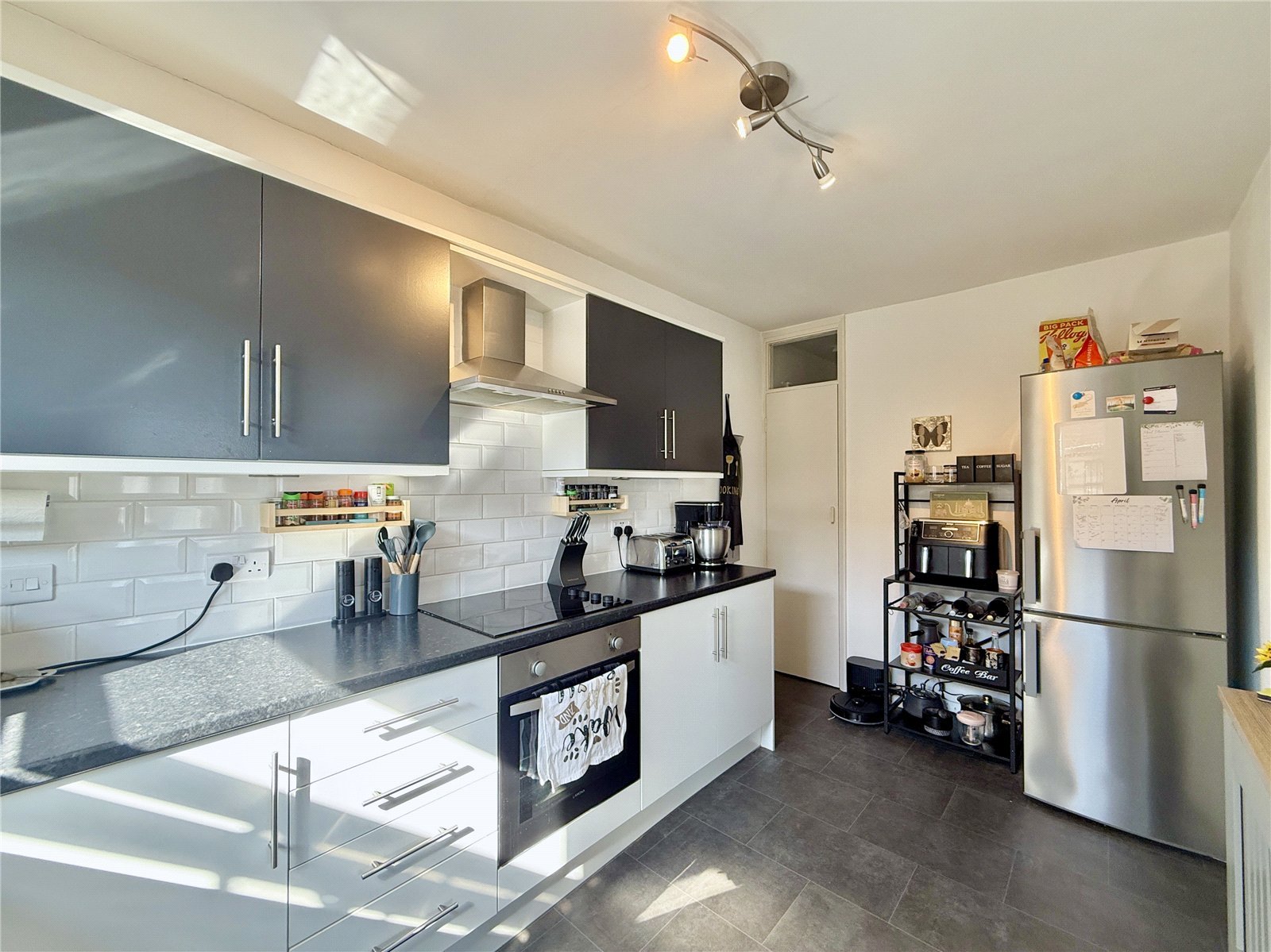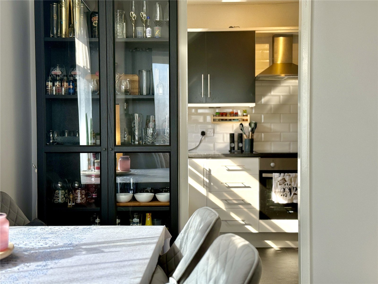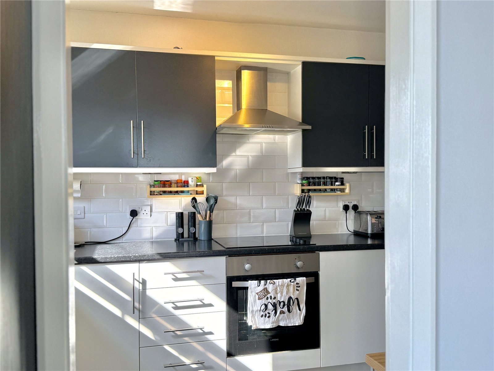 Adjacent to the living space is a modern fitted kitchen, complete with sleek cabinetry, ample worktop space, and a useful pantry cupboard, ideal for both everyday living and entertaining.