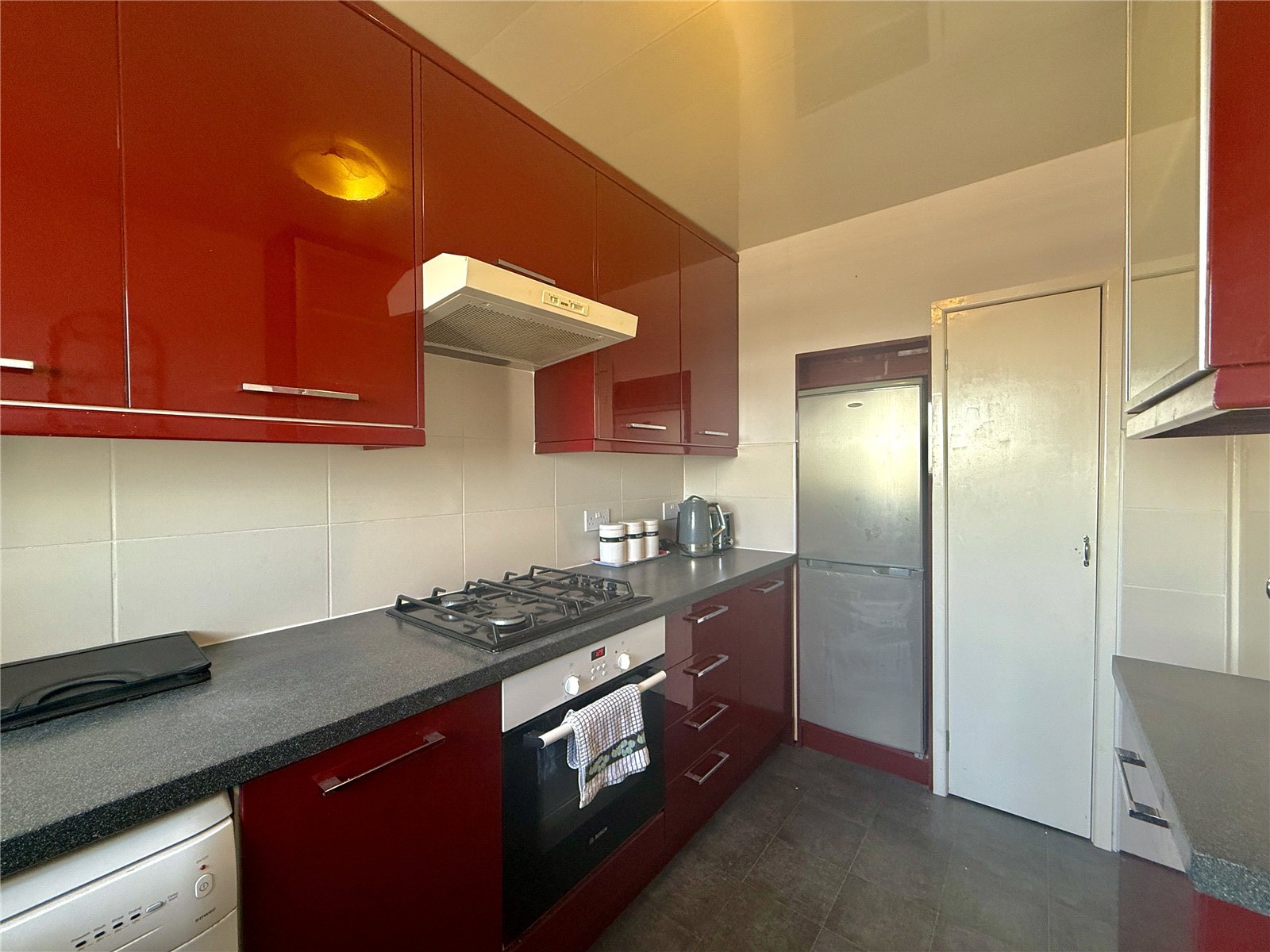 Adjacent to the living area is a well-appointed kitchen, providing ample storage, worktop space, and a useful pantry cupboard.