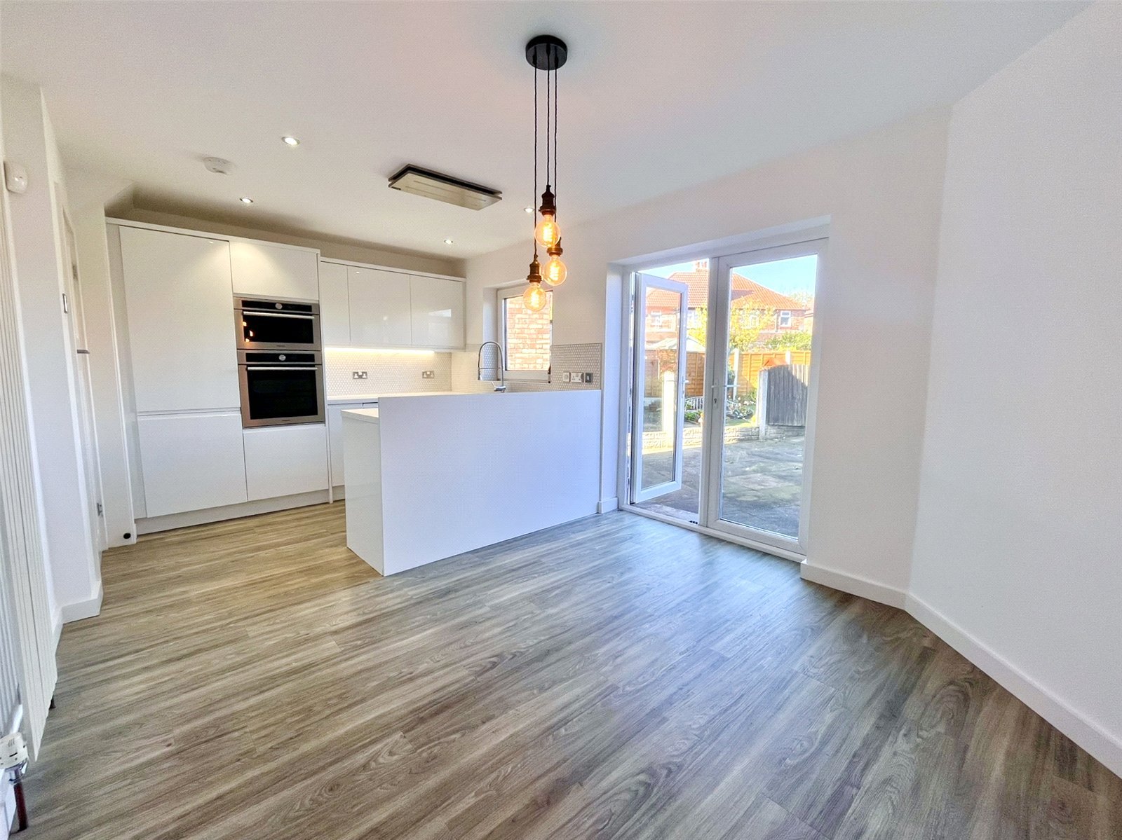 Upon entering, you are welcomed by an entrance hall leading through to a bright and spacious living room, enhanced by a bay window that allows for plenty of natural light. To the rear, a contemporary kitchen/diner provides a practical and sociable space, featuring sleek cabinetry, ample worktop space, and storage. French doors open directly onto the rear garden, creating a seamless connection between indoor and outdoor living.